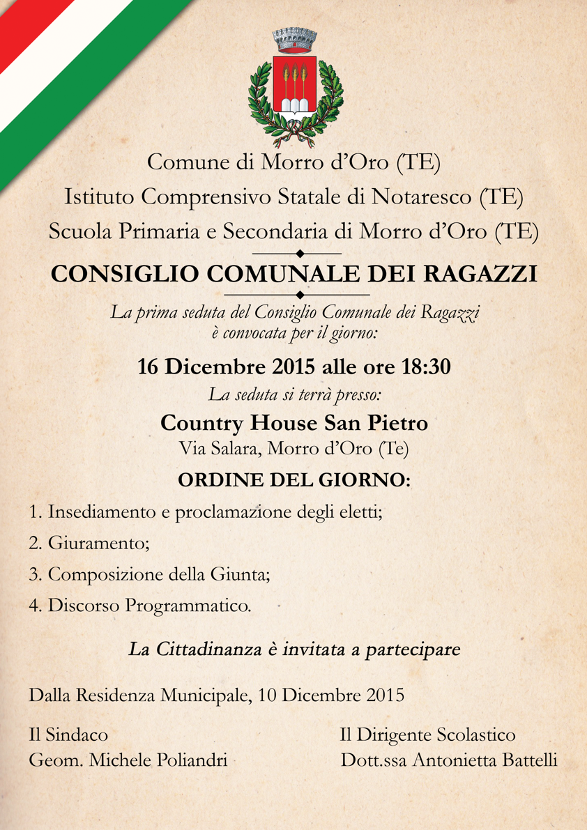La prima seduta del Consiglio Comunale dei Ragazzi è convocata per il giorno 16 Dicembre 2015 alle ore 18:30 presso Country House San Pietro.