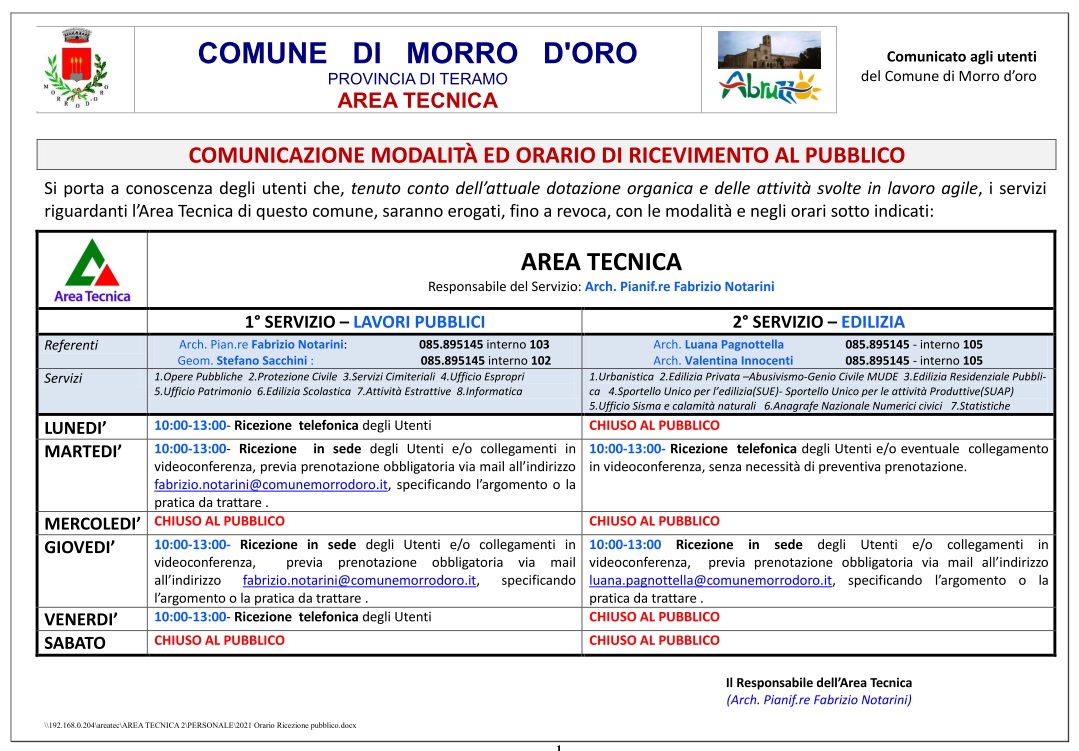 Si porta a conoscenza degli utenti che, tenuto conto dell’attuale dotazione organica e delle attività svolte in lavoro agile, i servizi riguardanti l’Area Tecnica di questo comune, saranno erogati, fino a revoca, con le modalità e negli orari indicati nell'Avviso allegato alla presente.